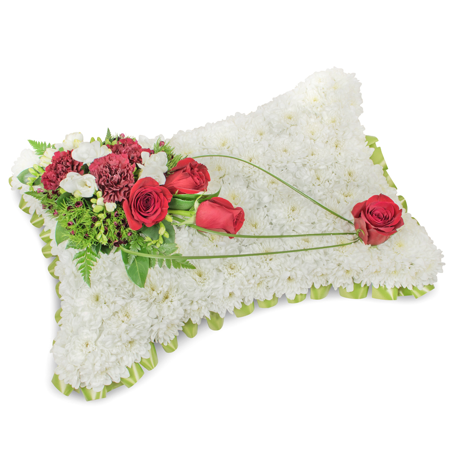 Share your sympathy with our beautifully arranged bouquet, featuring an exquisite selection of white chrysanthemums, red roses, white freesias, dark red carnations, dianthus, and bear grass. Each bloom is carefully hand-selected to ensure optimal freshness and vibrant color.